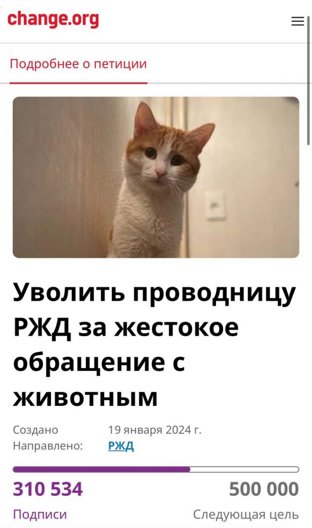 Запись Цифра дня: более 300 тысяч россиян подписали петицию с требованием уволить проводницу, выкинувшую из поезда кота Твикса впервые появилась PEOPLETALK.