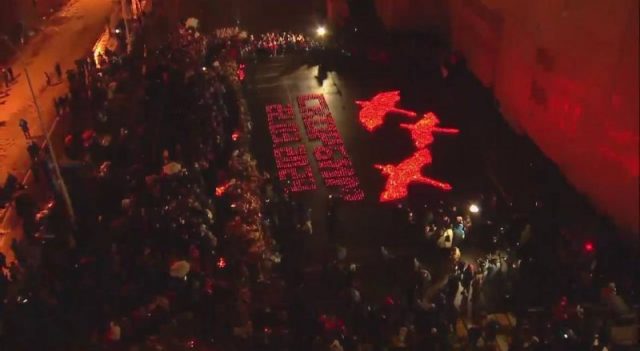 Прямо сейчас у «Крокус Сити Холла» проходит акция, участники которой зажгли сотни свечей, сформировав ими фразу «Скорбим 22.03.2024». На стене представлена проекция летящих журавлей, точно такую же сейчас выводят на здания во многих городах России. Оформление акции связано с композицией народного артиста СССР Муслима Магомаева «Журавли». Разрушенный при теракте концертный зал был назван в честь исполнителя.