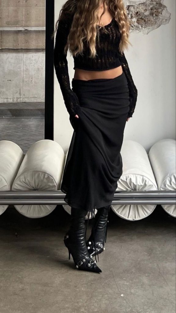 Так, накануне Эльза Хоск продемонстрировала нам очередной образ, который точно стоит повторить этим летом. Модель позирует в стильном ансамбле из юбки макси и кроп-топа. И здесь мы считываем сразу два тренда: во-первых, экстремальная низкая посадка, которая все еще главенствует на вершине модного олимпа, во-вторых, полупрозрачный материал, который после показа Saint Laurent окончательно закрепил статус главной тенденций сезона.
